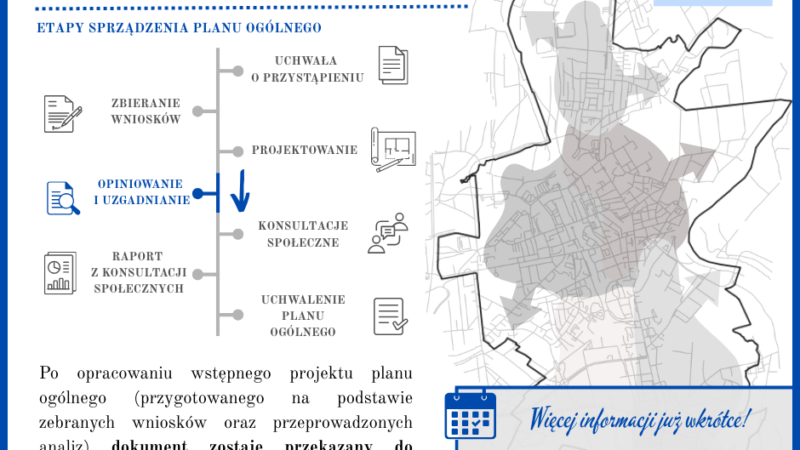Po zakończeniu etapu opiniowania i uzgodnień plan zostanie poddany konsultacjom społecznym. Mieszkańcy będą mogli zgłaszać uwagi do projektu PLANU OGÓLNEGO.